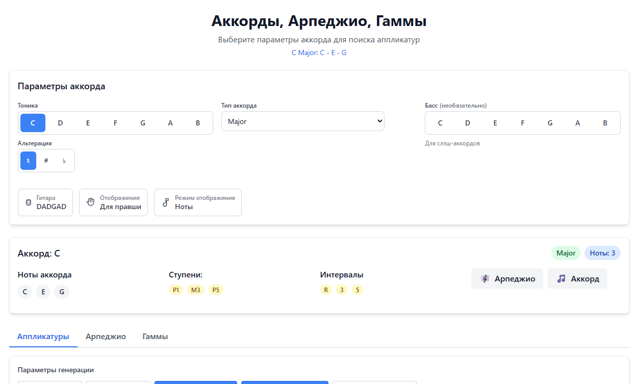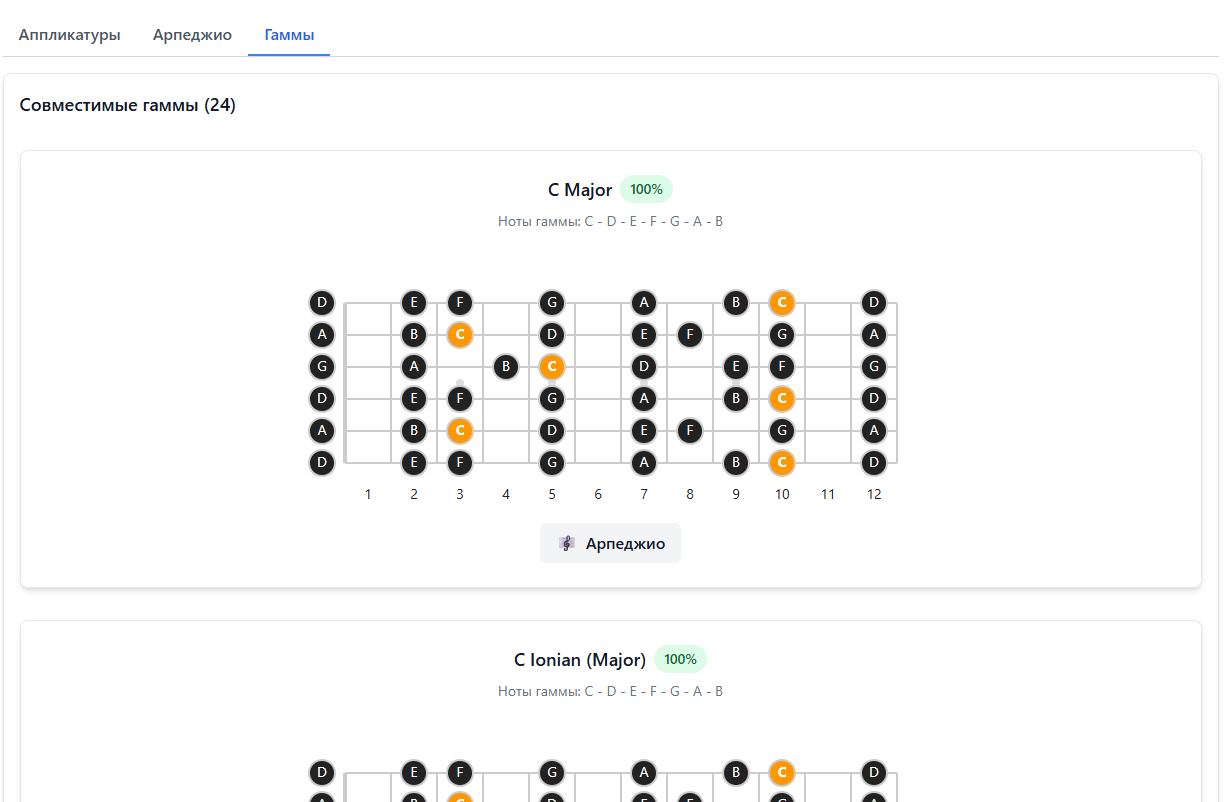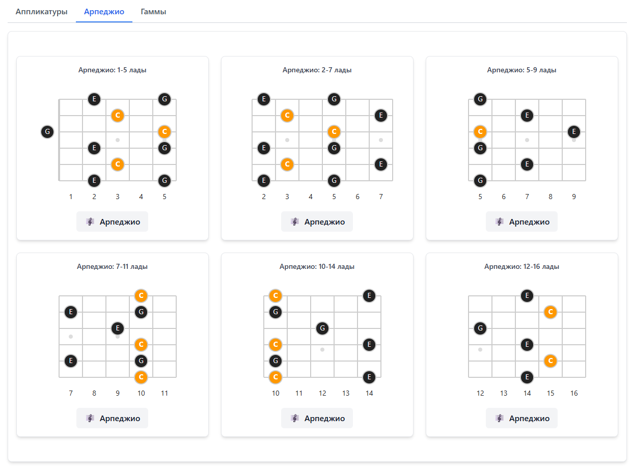 Этот раздел позволяет быстро находить аккорды, гаммы и аппликатуры арпеджио на грифе гитары. Можно выбрать тип аккорда или гаммы и увидеть все возможные варианты. Каждый вариант можно прослушать и увидеть его расположение на грифе. Для каждого аккорда во вкладке “Арпеджио” показаны аппликатуры в разных позициях. А во вкладке “Гаммы” - все совместимые гаммы, которыми можно обыграть выбранный аккорд. Кроме того, есть возможность выбрать строй гитары и увидеть, как аккорд или гамма будут выглядеть в этом строе.