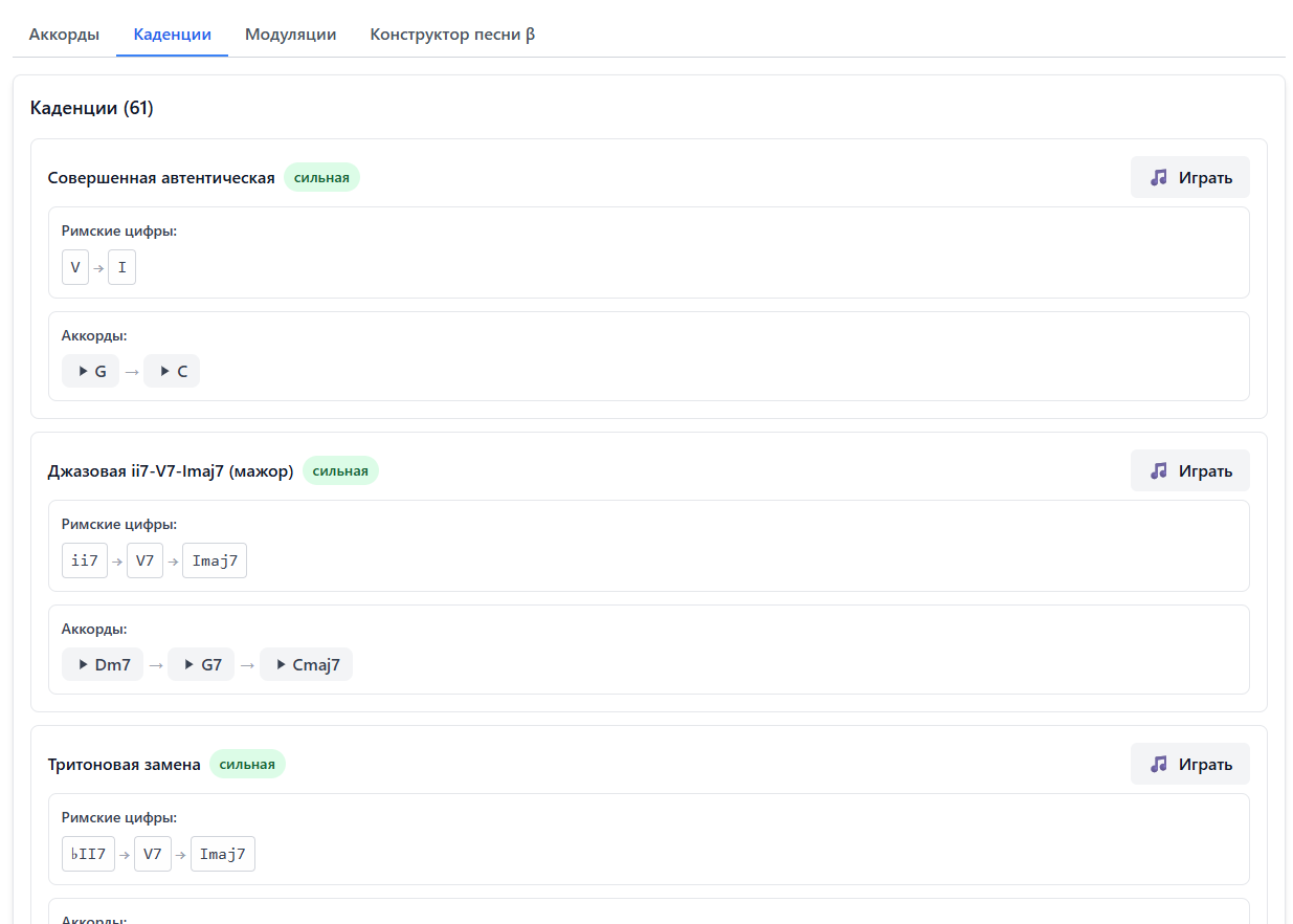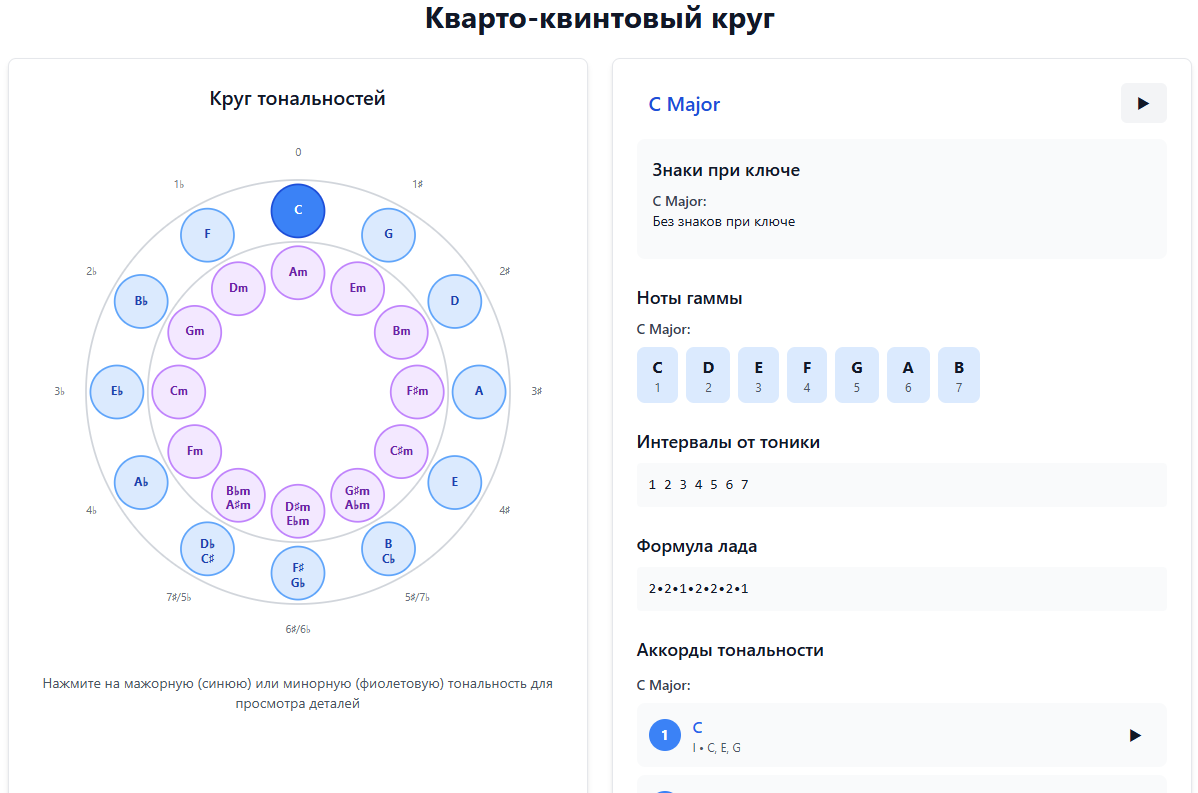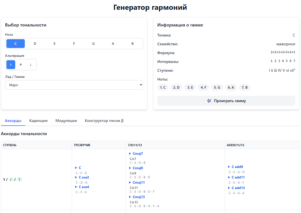 Данный раздел позволяет изучать гармонию, тональности и лады. Выбрав тональность, можно увидеть все аккорды и гаммы, которые к ней относятся. Каждый аккорд можно прослушать. Кроме того, можно прослушать распростанённые аккордовые прогрессии в выбранной тональности.