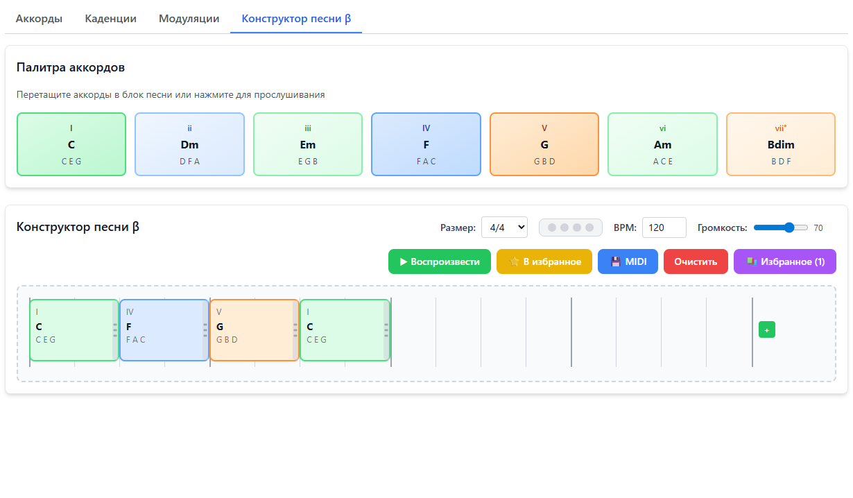 А самой главной фишкой этого раздела является “Конструктор песни”. С его помощью можно создавать собственные аккордовые прогрессии, слушать их и сохранять для дальнейшего использования. Экспорт в миди файл позволяет использовать созданные прогрессии в цифровых аудио рабочих станциях (DAW).